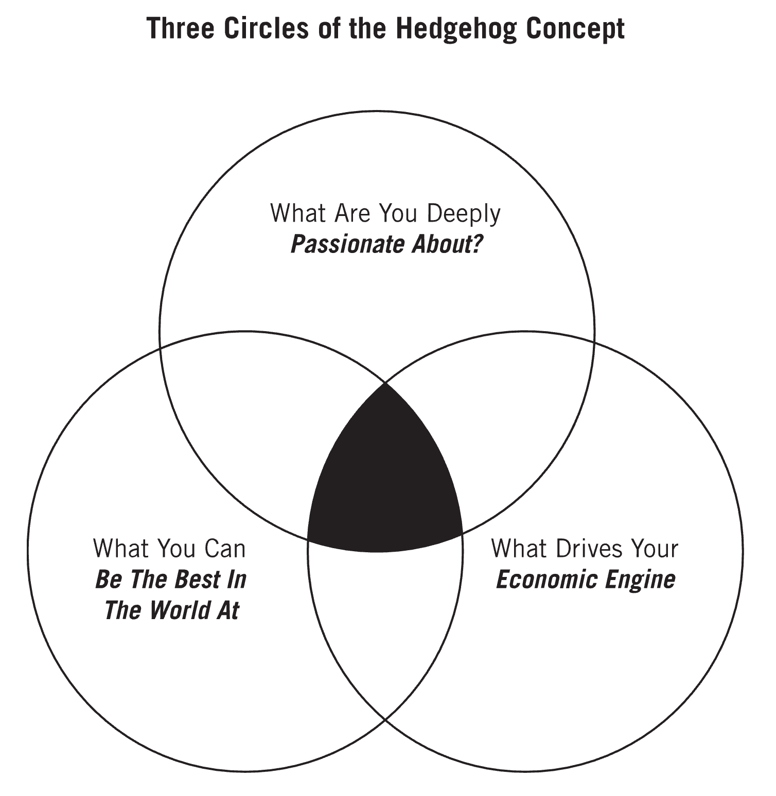 Usually the “hedgehog concept” is depicted as three intersecting circles. Each one contains a range of answers to one of three questions: