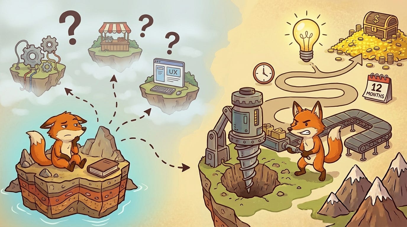 Here’s some initial diagnostic. If you’ve been “preparing to launch” for more than three months, you’re stuck in fox thinking. You’re mapping. If your business is in year two and you’re still “exploring opportunities,” same problem. You never started drilling.